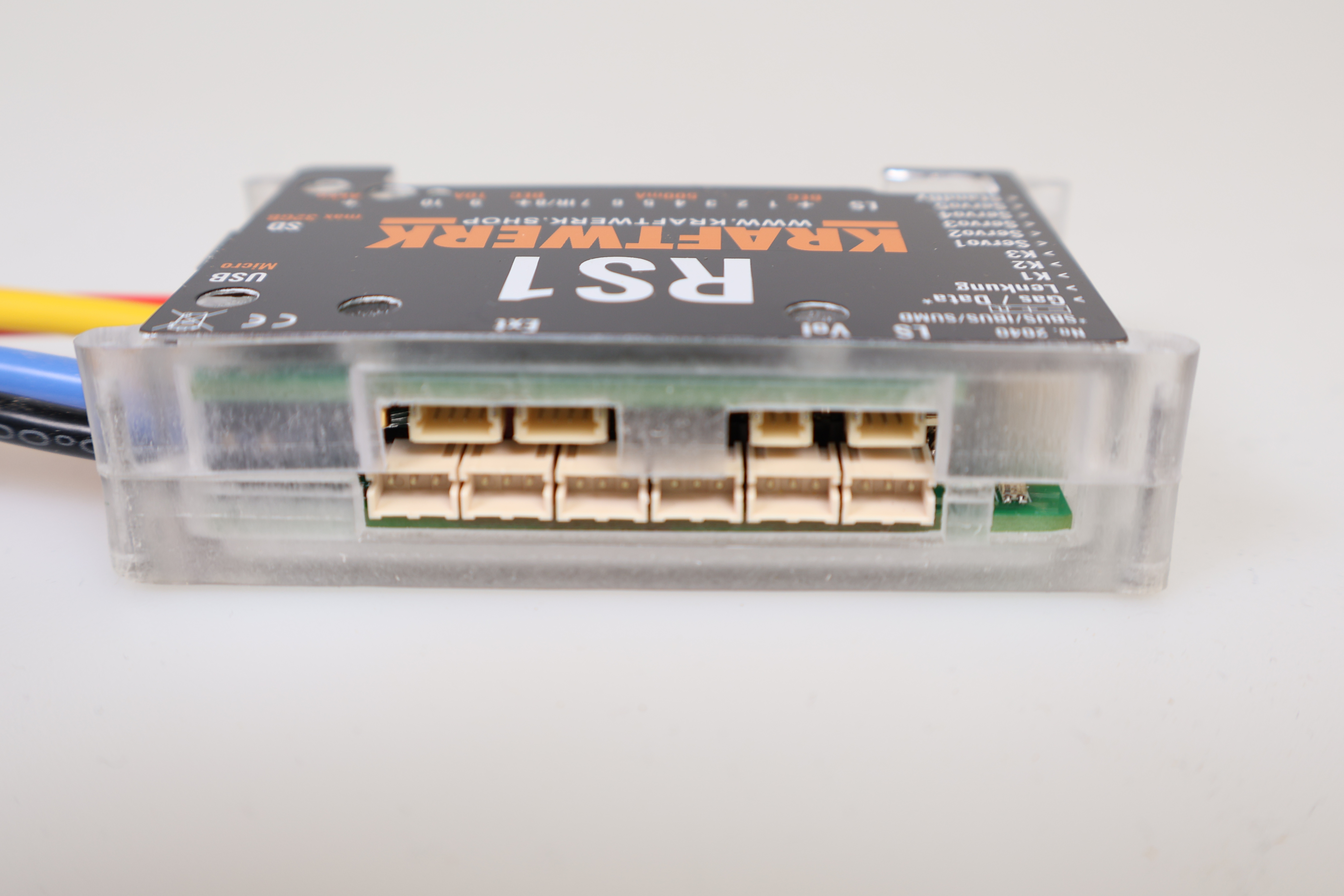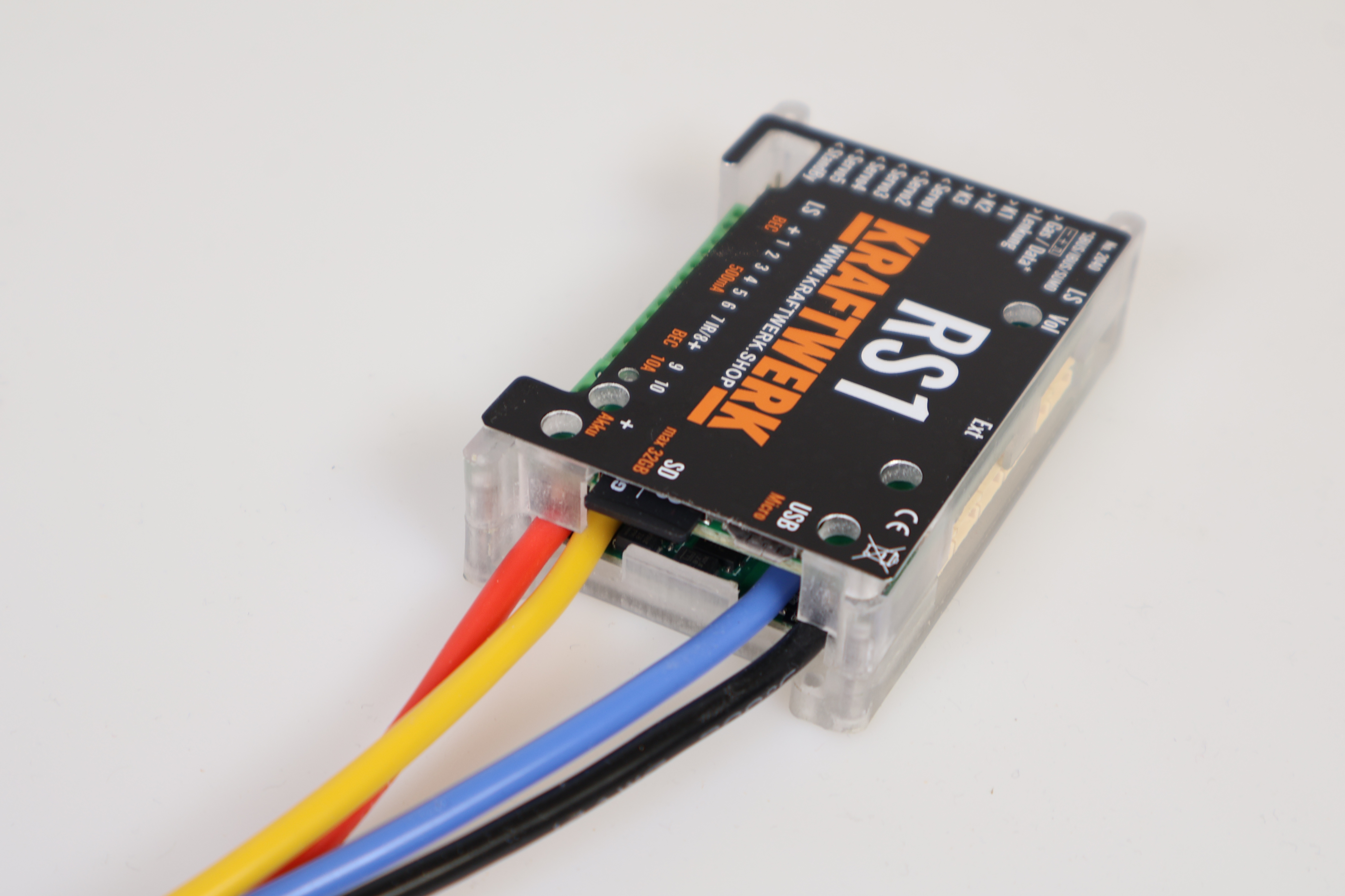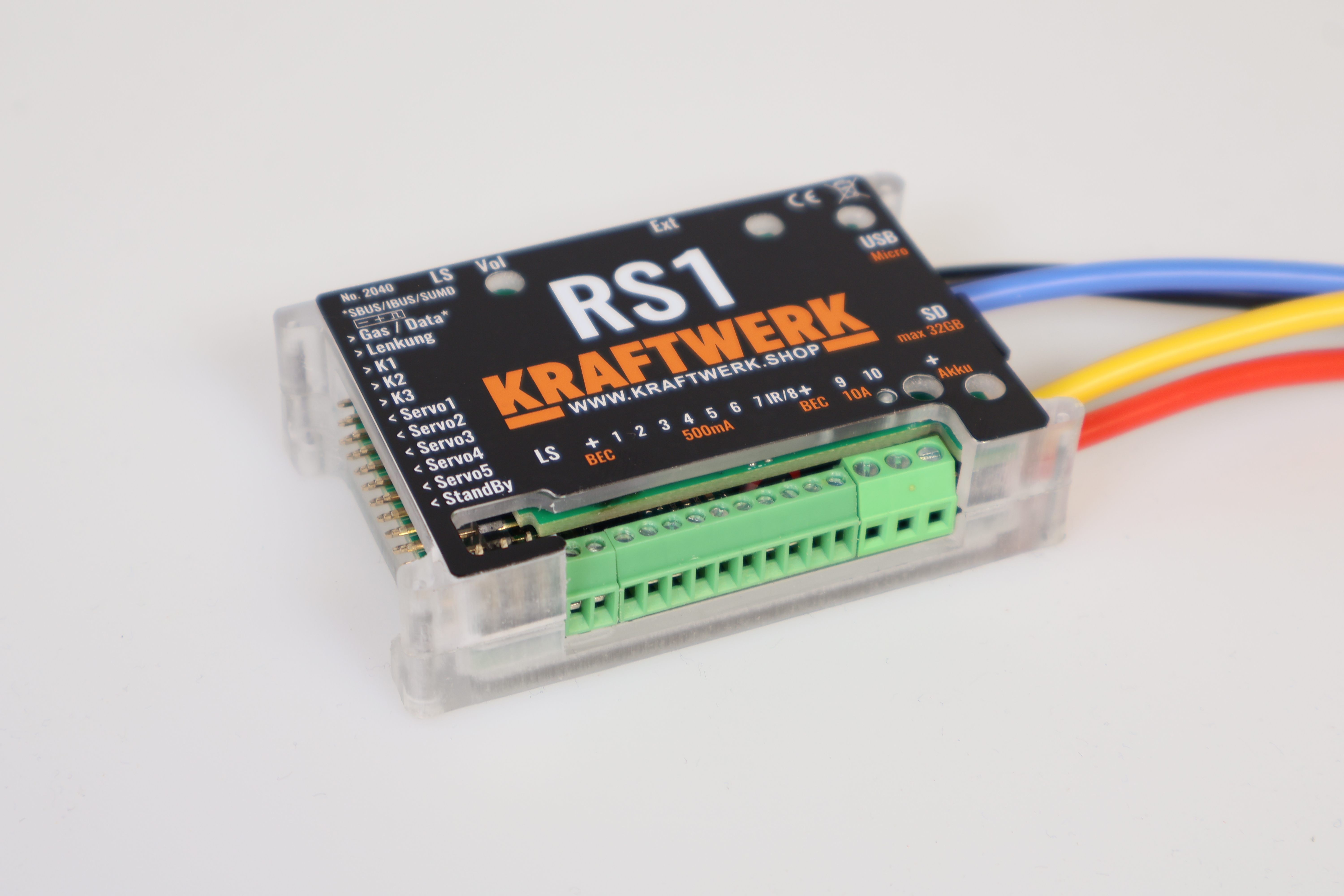 Die RS1 Regler-Soundkombination vereint Fahrregler, Soundmodul und Lichtanlage in einem kompakten Modul. Sie kann an bis zu fünf Kanäle eines beliebigen Empfängers angeschlossen werden und unterstützt zusätzlich SUMD, IBUS und SBUS, wodurch bis zu 32 Kanäle im System verfügbar sind.