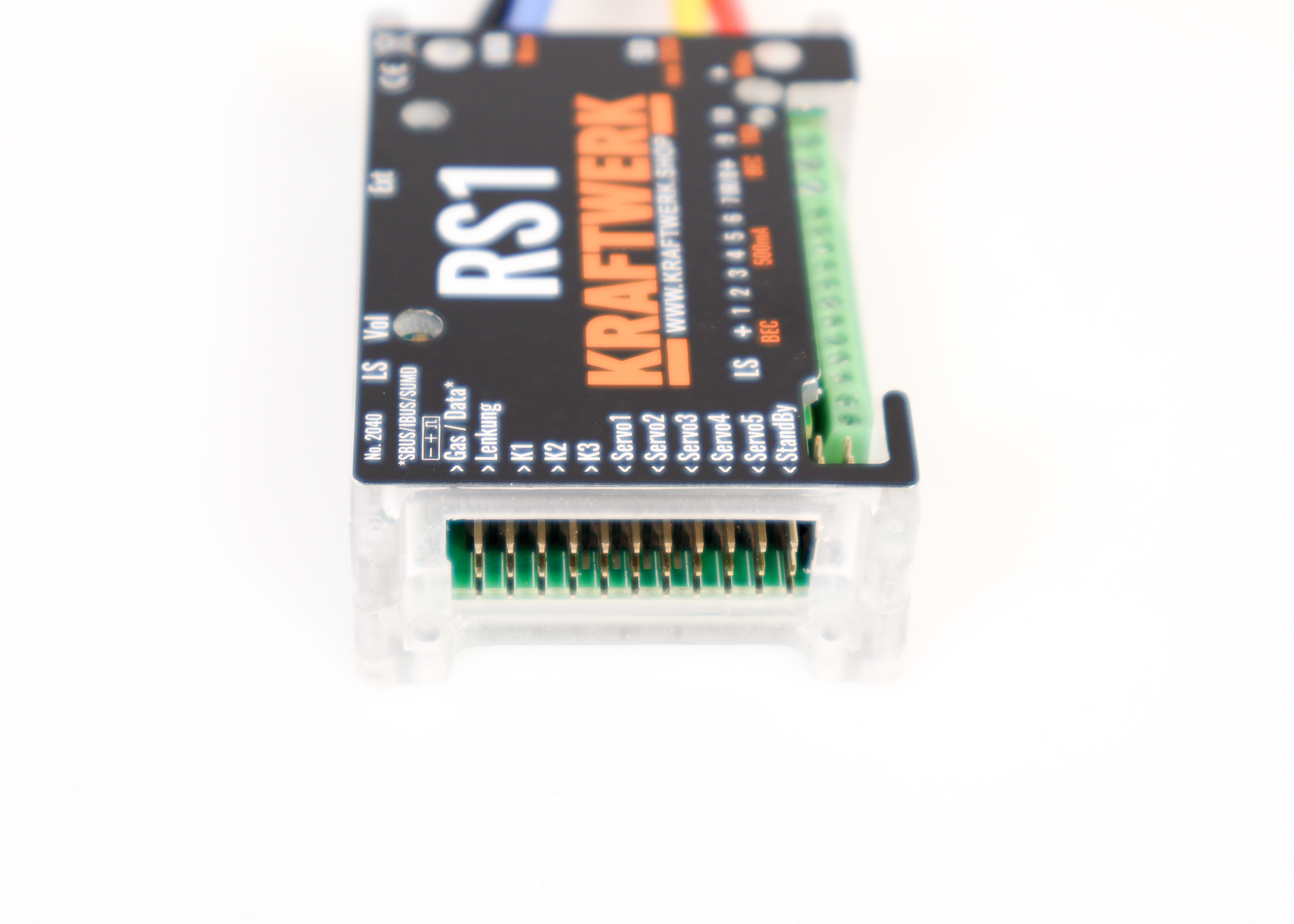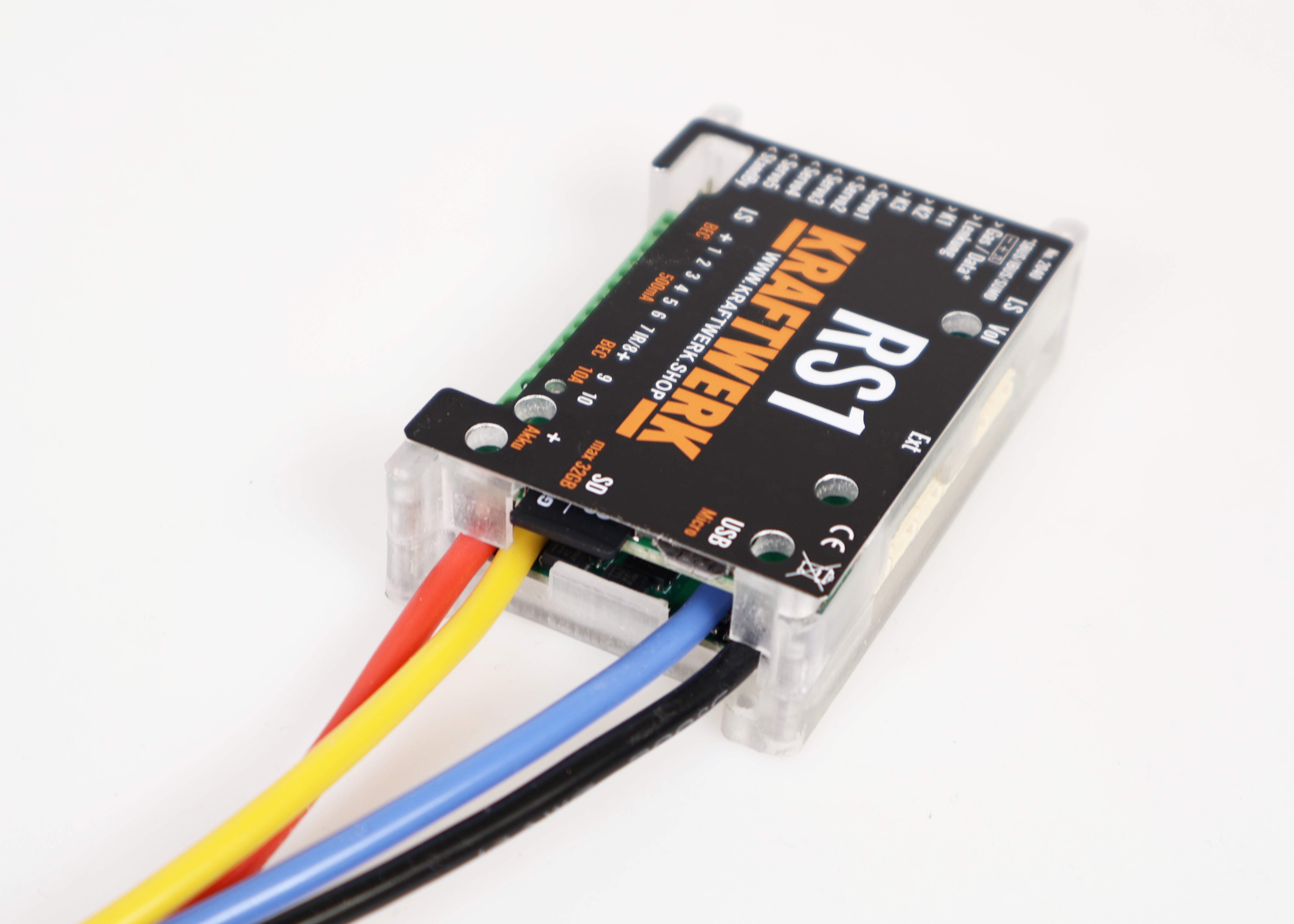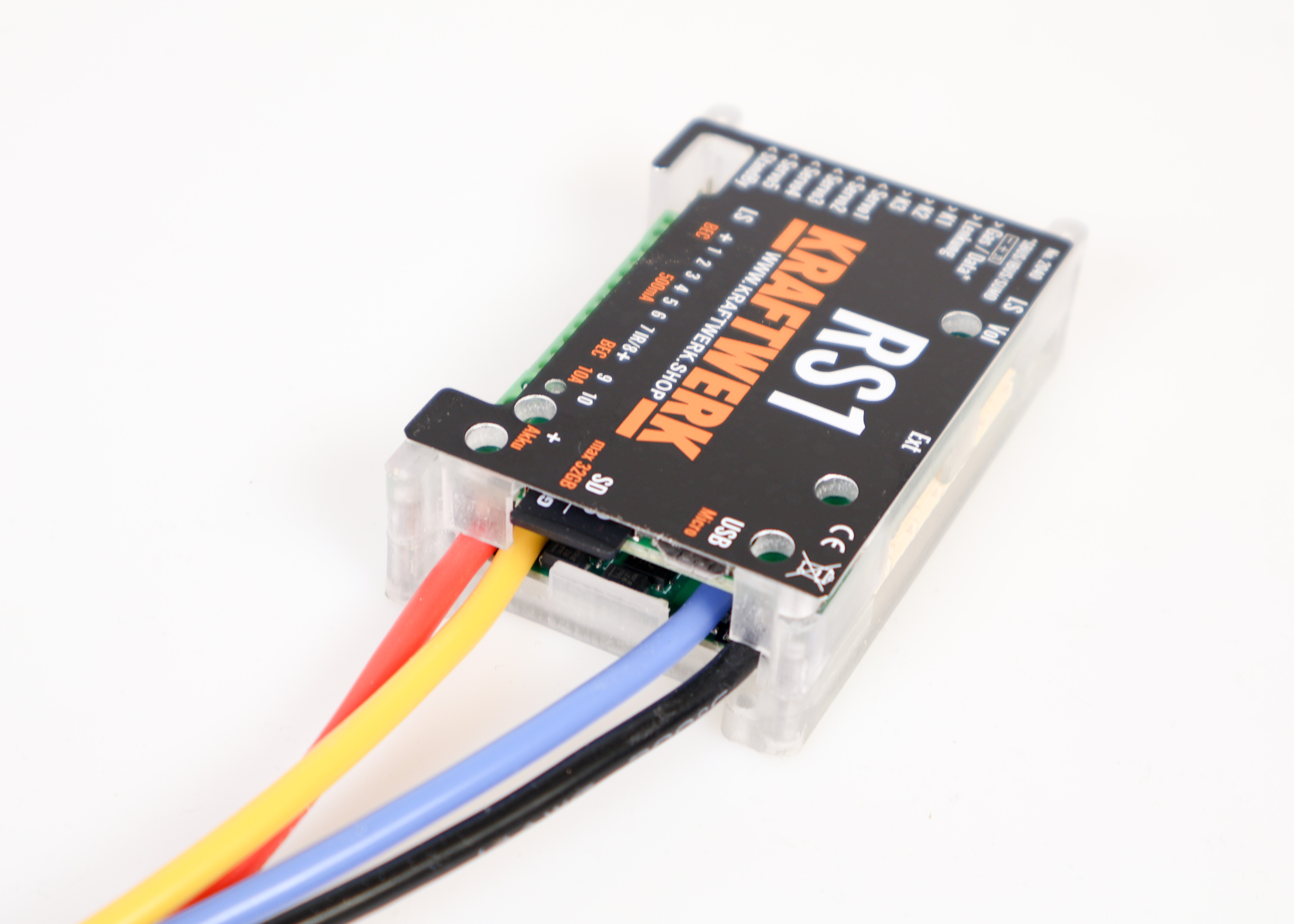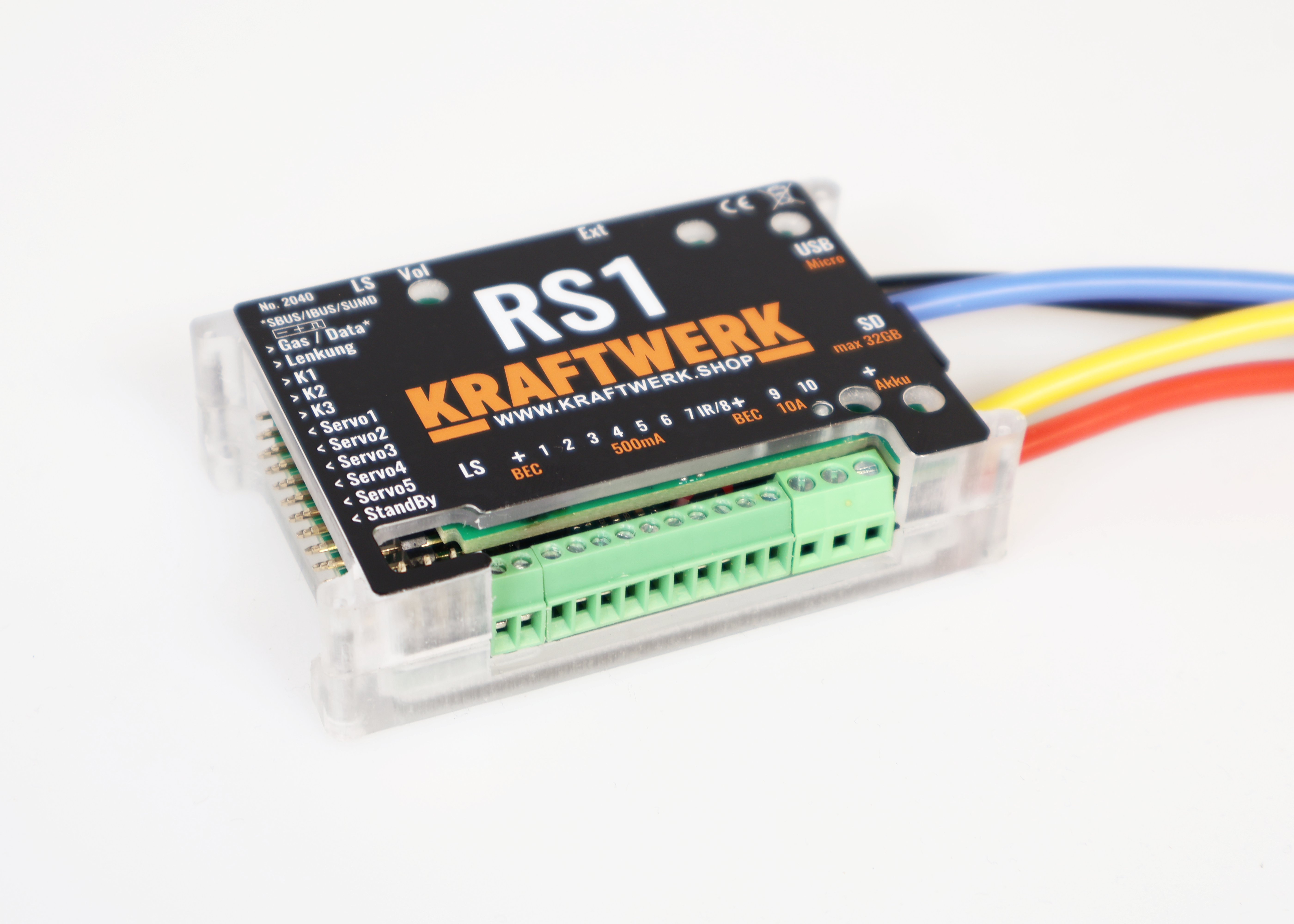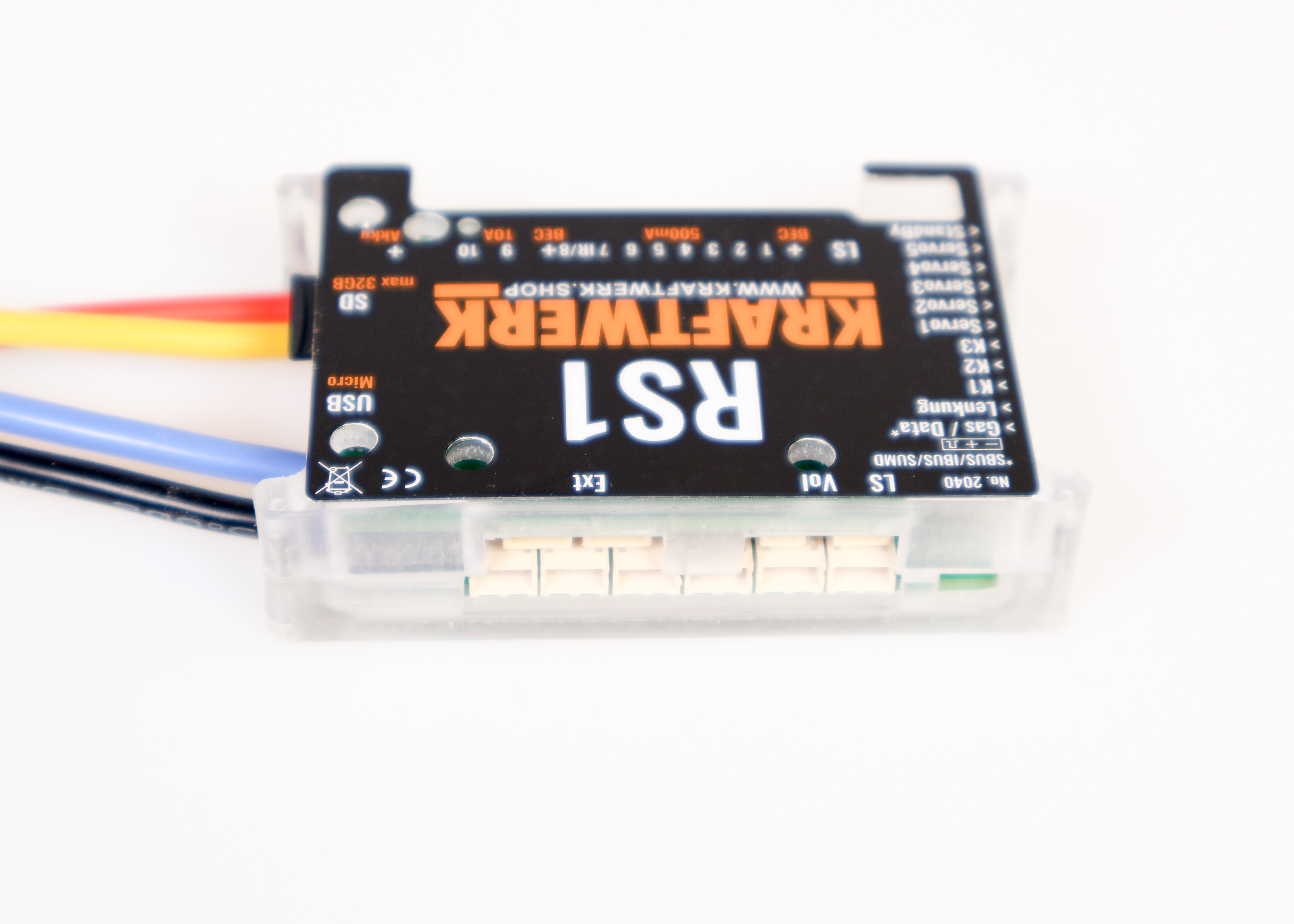 Die RS1 Regler-Soundkombination integriert Fahrregler, Soundmodul und Lichtanlage in einem kompakten Modul. Sie lässt sich an bis zu fünf Kanäle eines beliebigen Empfängers anschließen und unterstützt zusätzlich SUMD, IBUS und SBUS, wodurch bis zu 32 Kanäle im System verfügbar sind.